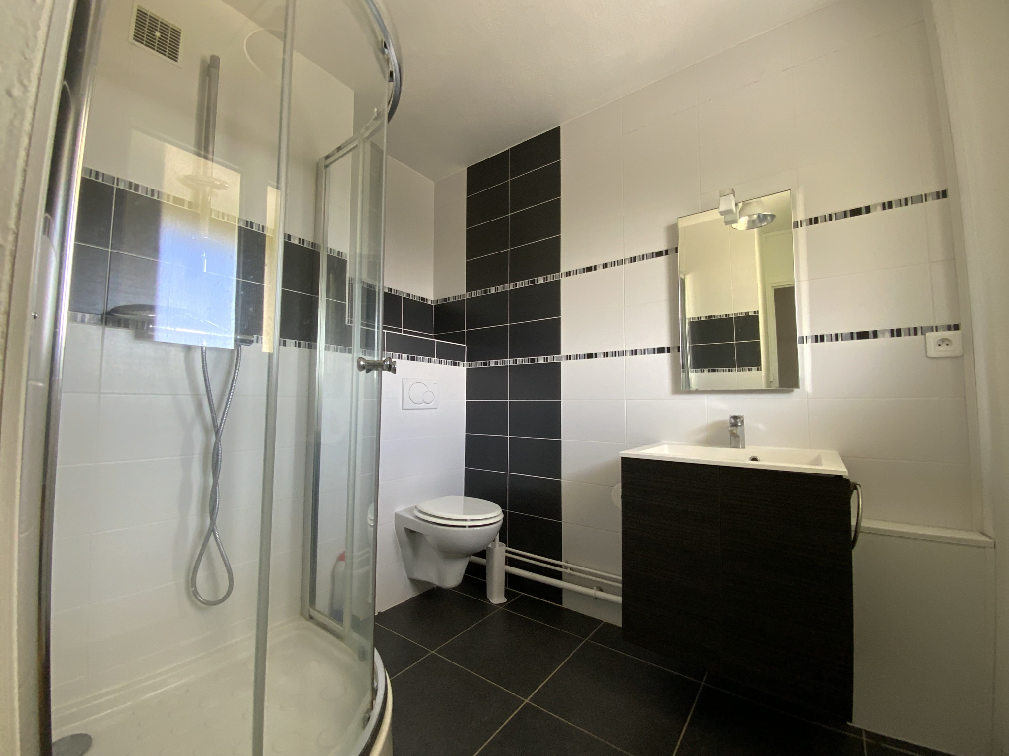Appartement 1 pièce de 29.64 m² au 3ème étage avec ascenseur d'une coprorpiété composé : d'une entrée sur le couloir avec un grand placard de rangement composé d'une partie penderie, d'étagères et de tiroirs de rangement, d'une salle de douche avec cabine de douche, WC, meuble vasque avec miroir, d'une pièce de vie exposée plein sud avec cuisine ouverte, aménagée et semi équipée d'une plaque de cuisson électrique, d'une hotte aspirante, d'un évier inox et de caissons de rangement haut et bas.